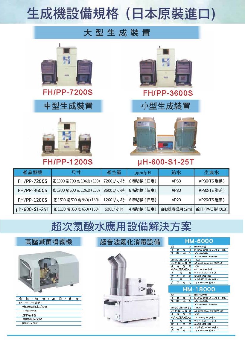 日本原裝進口超次氯酸水生成機及周邊設備之行銷、規劃及安裝。