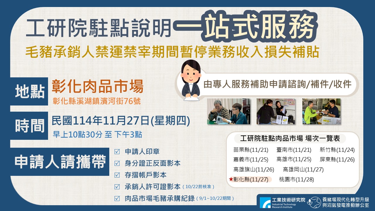 (彰化肉品市場)毛豬承銷人禁運禁宰期間暫停業務收入損失補貼_工研院駐點說明