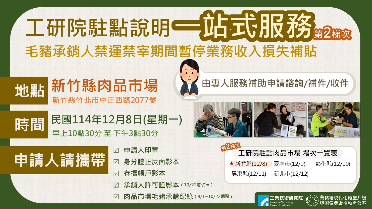 (新竹縣肉品市場)毛豬承銷人禁運禁宰期間暫停業務收入損失補貼_工研院駐點說明