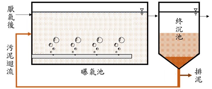 在養豬場三段式廢水處理流程中,好氧處理單元設置的水力停留時間(HRT)建議至少為1.5天,設置位置接續在厭氧處理單元之後、放流水池之前,因此好氧系統效能將直接影響放流水水質。處理策略為藉由微生物利用空氣中的氧氣將厭氣後廢水中剩餘的BOD進行分解,但由於曝氣方式會使污泥混在出流中被帶出,因此後端需建置終沉池,將污泥流留在系統內,以符合放流水懸浮固體物(suspended solid, SS)之排放標準。