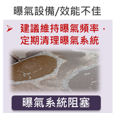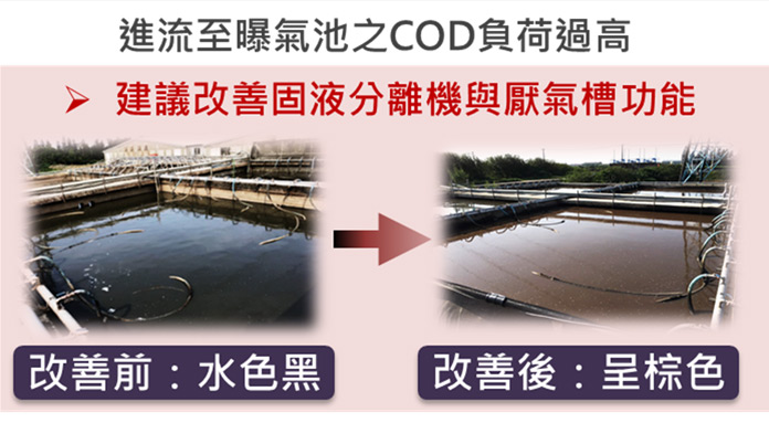 曝氣池接續厭氣池處理,若前端厭氣池功能表現不佳,使COD殘存量高於原本曝氣池設計的餘裕量,導入曝氣池後多餘的COD無法被有效處理,於此這狀況下,通常曝氣池外觀水色較黑,顯示有機質含量多,其曝氣供氧率不足,使曝氣池整體環境呈無氧狀況,針對此情形,建議優先改善前端厭氣池,使其具良好處理效能,以降低後端曝氣池負荷,提升放流水水質,若厭氣槽COD濃度為1,000-1,200 mg/L,則建議提升曝氣溶氧量,以達放流水標準。