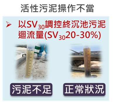 曝氣池於曝氣過程中將造成水體擾動,使懸浮污泥容易流洗至終沉池,造成污泥濃度過低,進而影響曝氣池功能,因此為提升曝氣池處理效能,可透過迴流終沉池污泥提升污泥濃度,並定期排出污泥維持污泥活性,此過程稱之活性污泥處理法。為控制曝氣池污泥濃度,可藉由SV30沉降試驗判斷污泥活性,藉以評估排泥量,其SV30測試方式以容器裝取曝氣池水並靜置30分鐘,沉降污泥體積需佔25-30%之間,若污泥濃度不足(如下圖)建議由終沉池迴流污泥,搭配曝氣頻率調整,馴養活性污泥;反之,若SV30高於25-30%則需增加廢棄污泥排出量。