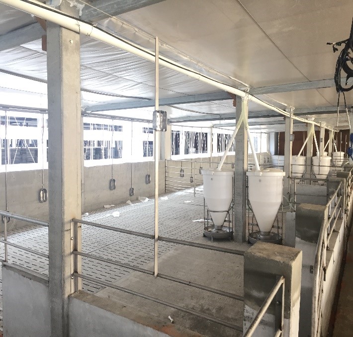可依照牧場管理需求或飼養豬隻階段,選擇合適材質建置全高床或半高床。半高床之常見形式為部分實心地面搭配部分水泥條狀地板或鑄鐵漏糞地板,以減少糞尿堆積於欄位中,兼具有部分實心地板供豬隻休息或利於跑動。牧場也可根據建置預算與飼養管理規劃,選擇全高床之欄為設計形式,具有更佳之落糞效果,也大量減少欄位清潔沖洗之用水及人力,並減低病原菌滋生。下列提供半高床及全設計之實景圖供參考。