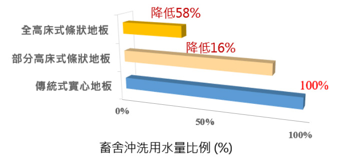 高床式地板相較傳統實心地板降低之畜舍沖洗用水量比例: